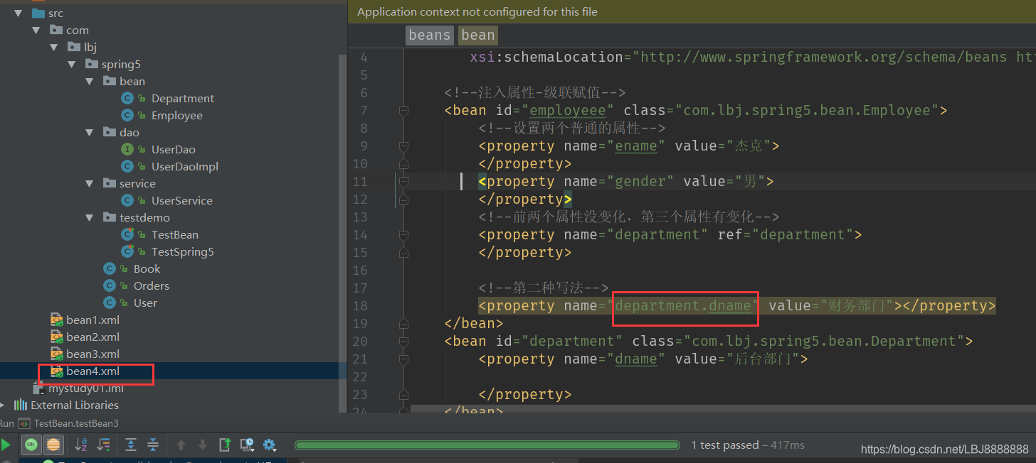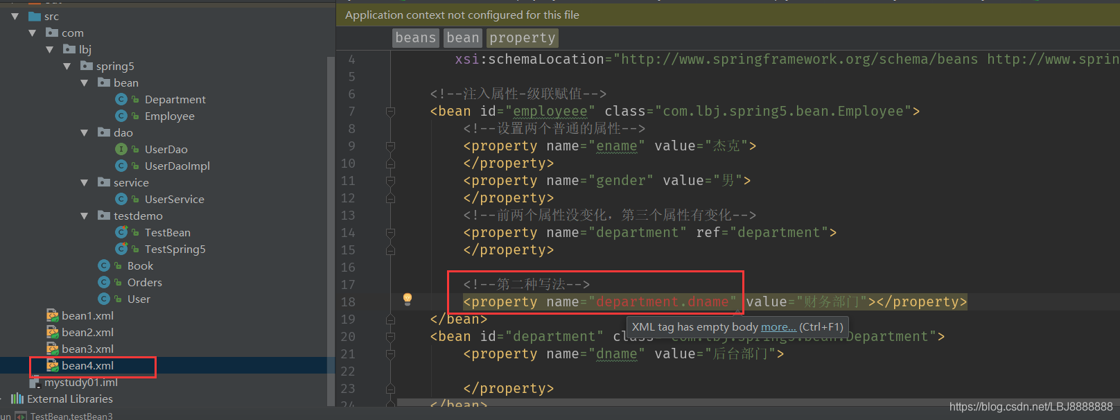 为了方便起见,我们再次新建一个新的bean4.xml配置文件来进行 级联赋值 操作【类似外部bean注入】