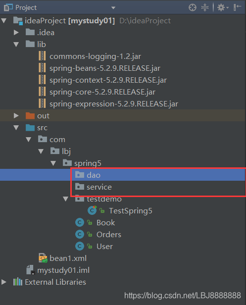 (1)创建两个类 service 类和 dao 类【分别创建两个包存放两个类】