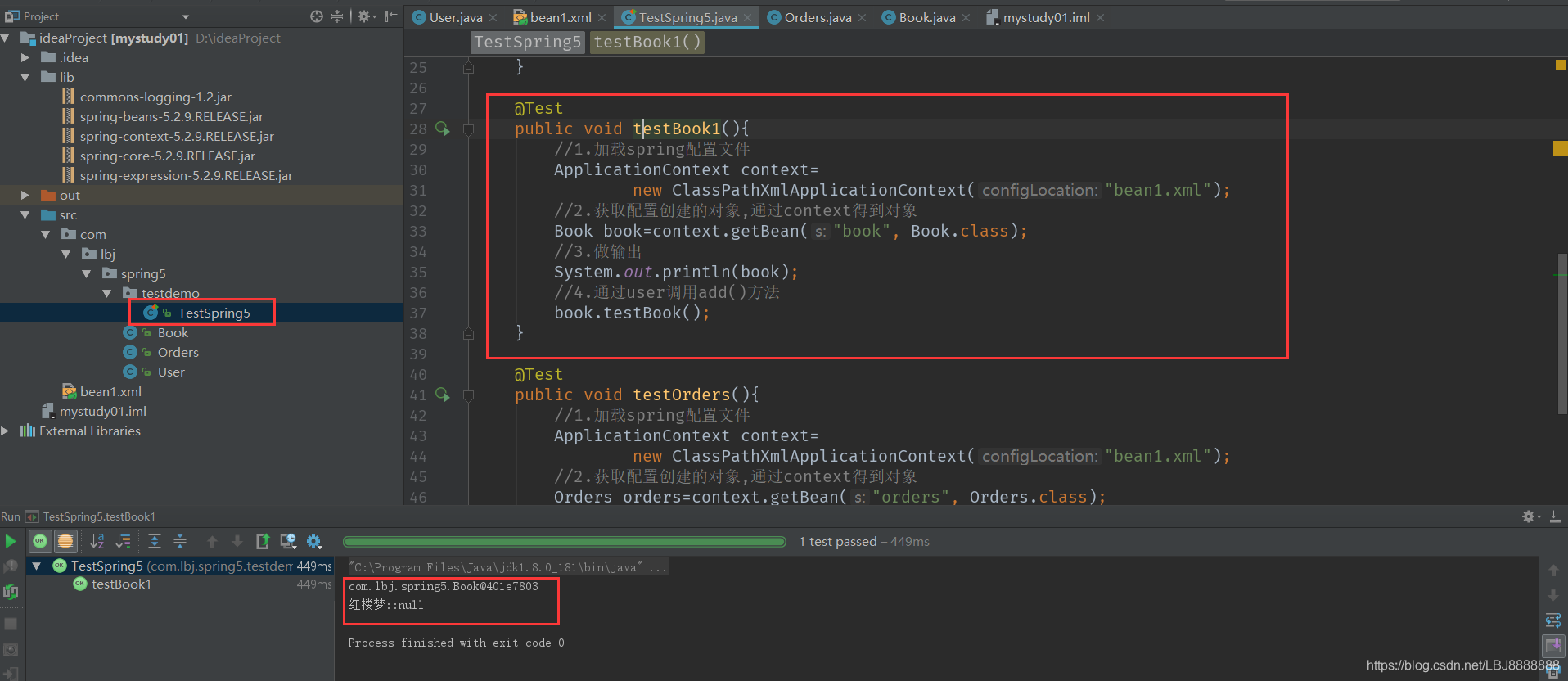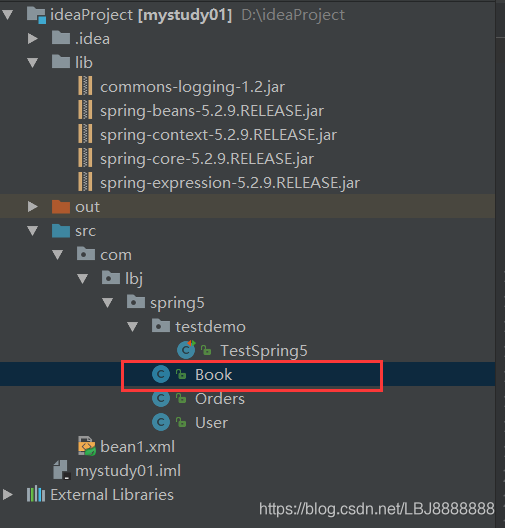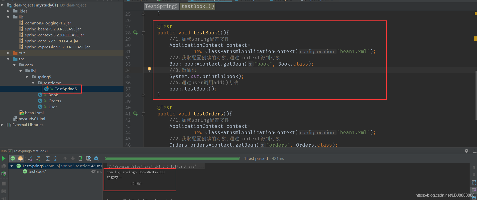 public class Book {//在类中创建属性:往book类中写入一个属性private String bname;//写入一个地址属性,假设这个属性的注入是空的值private String address;//创建属性对应的set方法:set方法注入属性public void setBname(String bname) {this.bname = bname;}//创建属性对应的set方法:set方法注入属性public void setAddress(String address) {this.address = address;}public void testBook(){System.out.println(bname+"::"+address);}