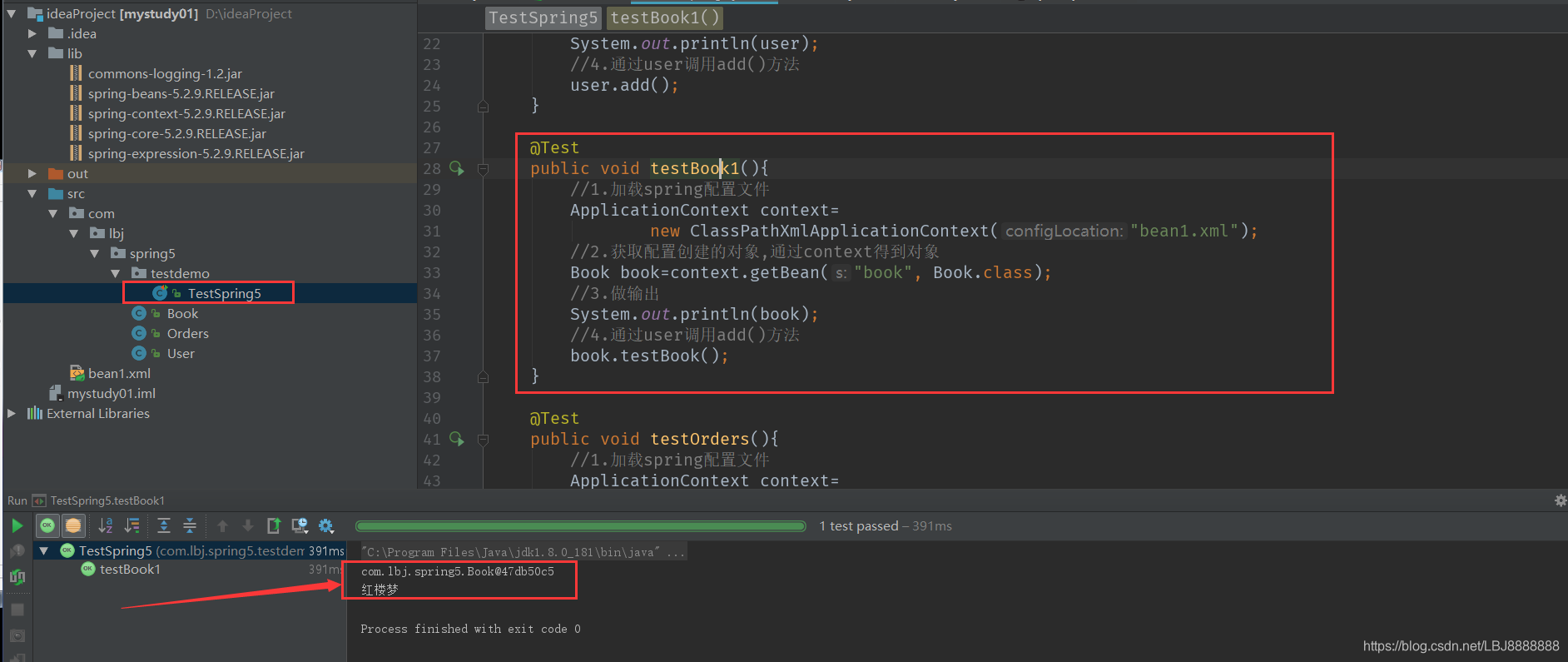 <bean id="book" class="com.lbj.spring5.Book"><!--使用property完成属性注入name:类里面的属性名称value:向属性注入的值--><property name="bname" value="红楼梦"></property>