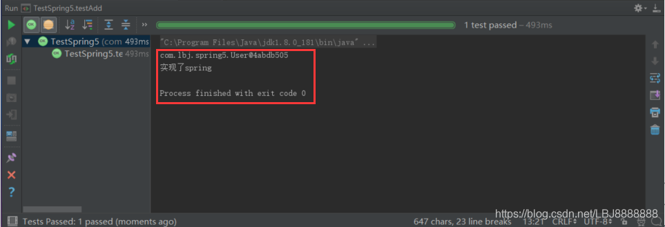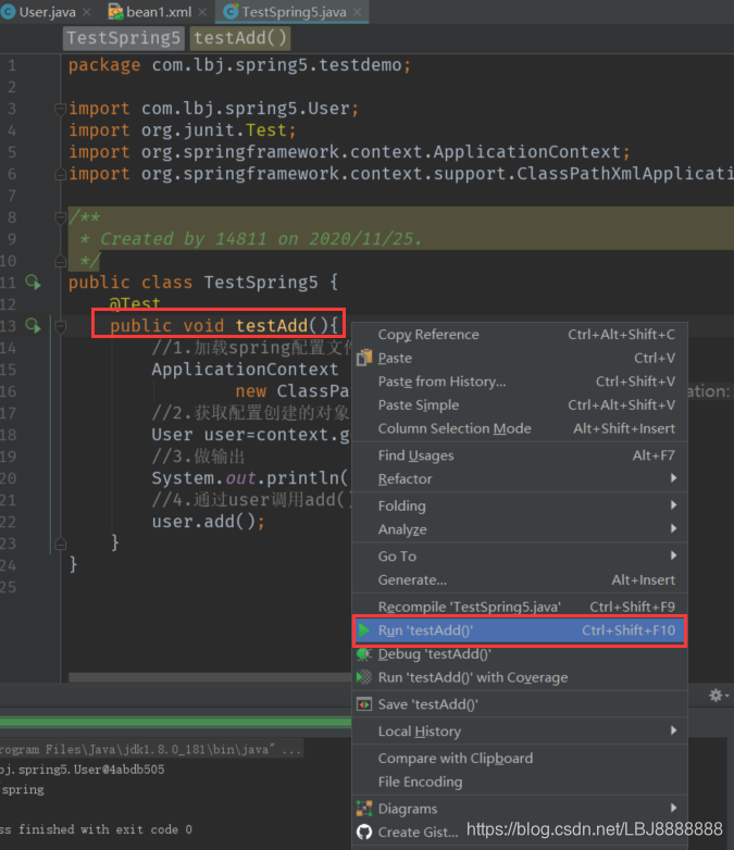 import org.springframework.context.support.ClassPathXmlApplicationContext;public class TestSpring5 {@Testpublic void testAdd(){//1.加载spring配置文件//这个参数是通过上下文配置文件找到xml配置文件ApplicationContext context=new ClassPathXmlApplicationContext("bean1.xml");//2.获取配置创建的对象,通过context.getBean()方法,得到对象User user=context.getBean("user", User.class);//3.做输出System.out.println(user);//4.通过user调用add()方法user.add();}