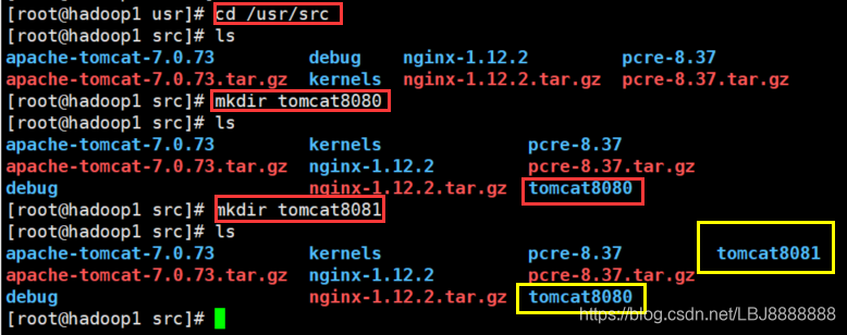 在 /usr/src 下建两个文件夹,一个是 tomcat8080 ,一个是 tomcat8081