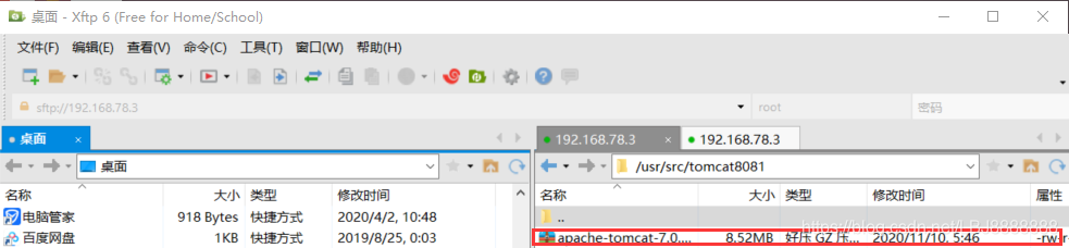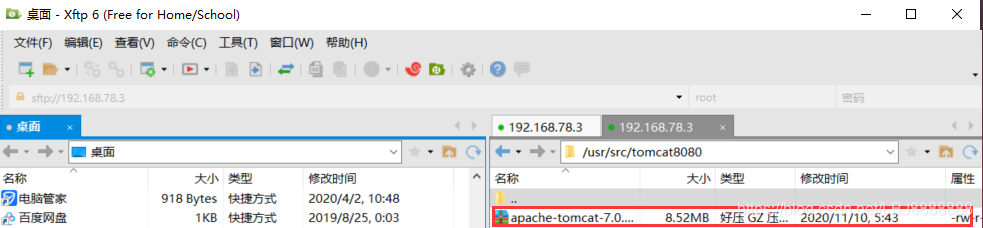 在xftp中将 tomcat 压缩包放置 /usr/src/tomcat8080 和 /usr/src/tomcat8081中