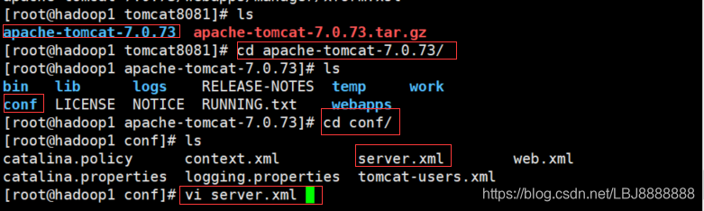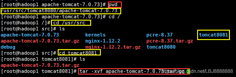 同样,进到tomcat8081文件夹中解压apache-tomcat-7.0.73.tar.gz(小技巧:用pwd查看当前文件的绝对路径)