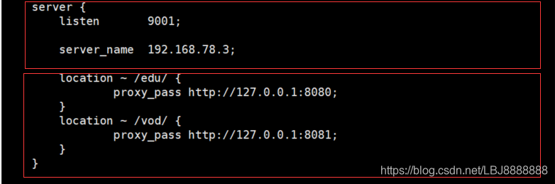 修改后(监听的端口是 9001,服务器名称是 192.168.78.3,规则是访问里面有 edu,就会跳转到 8080tomcat 服务器,当访问里面有 vod,就会跳转到 8081tomcat 服务器)