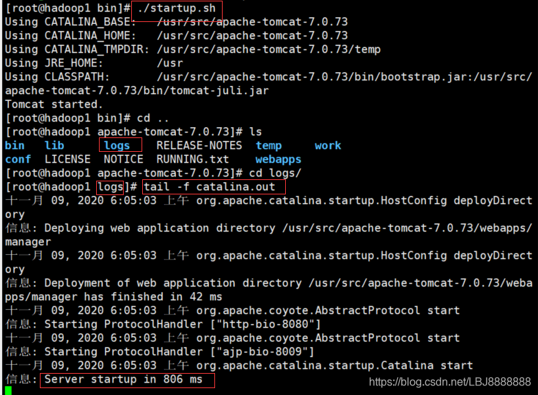 进入 tomcat 的bin路径,通过打开脚本文件./startup.sh启动tomcat服务器