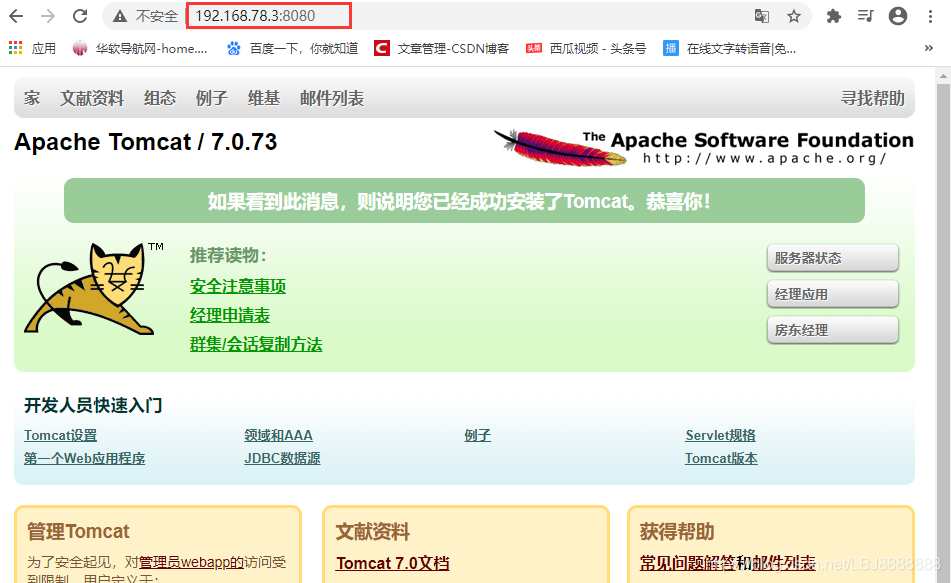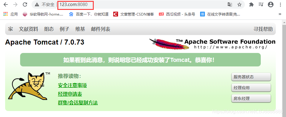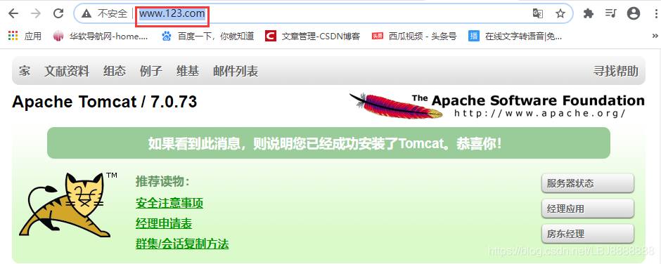 第三步:在浏览器中通过访问 www.123.com:8080 (因为tomcat服务器的默认端口是8080)访问到 192.168.78.3 Linux 服务器