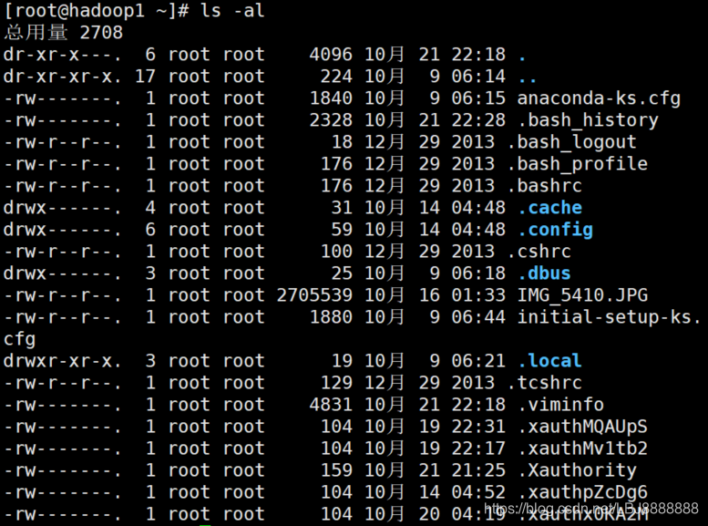 ls -a 显示当前目录下的所有文件及文件夹包括隐藏的.和..等