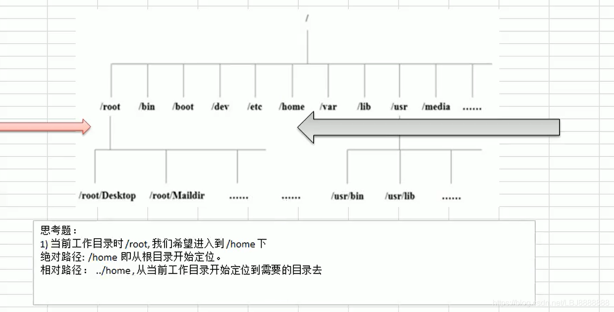 对这张图片的解释:绝对路径就是一切都是从头开始去找,从上往下一层一层去找,相对路径就是,你原本在的路径下,先去 ../找到你父亲节点的位置,再以父亲节点为头,从上往下一层一层去找../home,原理其实差不多