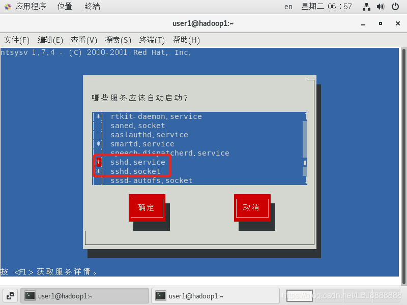 用上下箭头找到sshd.service后,按住键盘空格,开启或关闭服务,前面的*表示已经开启服务