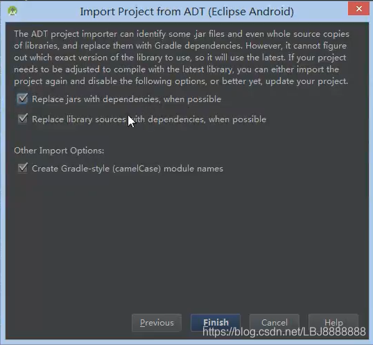 剩下的是finish即可,里面会提示:原本的eclipse是依赖一些jar包关系库去开发,现在的安卓开发会换成dependencies去开发