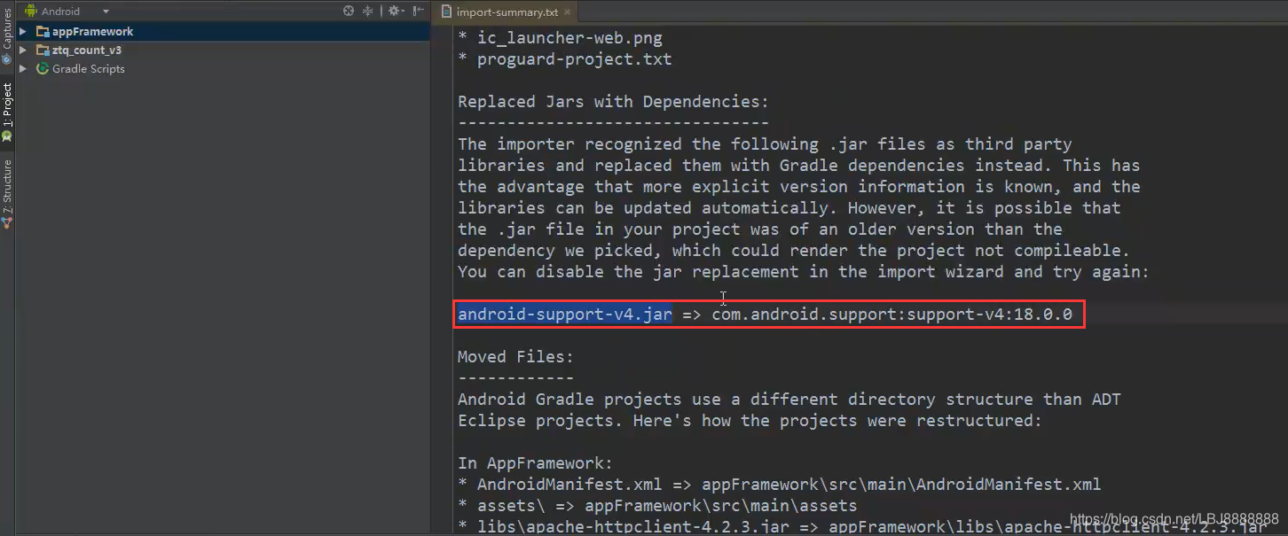加载完成后会有一个提示文档,里面有你项目的一些文件信息,标红的位置是表示属于项目外的一些文档,这些文档需要自己手动拷贝复制进去安卓开发项目中,默认情况下不导入也不会有太大问题