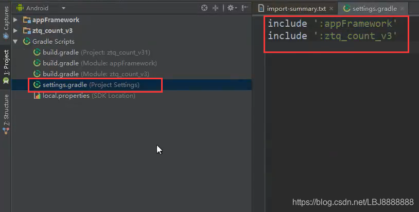 标红的地方表示的是项目的主工程模块,appFramework是为主工程服务的一个模块,这就体现了一开始说的Android studio的module是eclipse 的project 的思维
