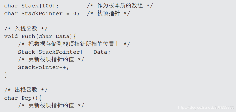 接下来编写两个函数,一个函数用于把数据存入到栈中,也叫作压入到栈中;另一个函数用于从栈中把数据取出来,也叫作从栈中弹出来。在这两个函数中,都需要更新栈中所存储的数据的总数,以及更 新栈顶指针的位置。也就是说通过使用由数组、栈顶指针以及入栈函 数和出栈函数所构成的集合,就能实现栈这种数据结构了