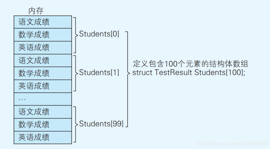 如果要编写一个用于处理 100 名学生考试成绩的程序,就需要定 义一个以 TestResult 为数据类型、包含 100 个元素的数组。通过定义, 在内存上就分配出了一块空间,能够存储 100 个数据的集合,每个数据的集合中都含有 Chinese、Math、English 三个数据项。接下来只要巧妙地运用结构体的数组就可以实现链表和二叉树了。