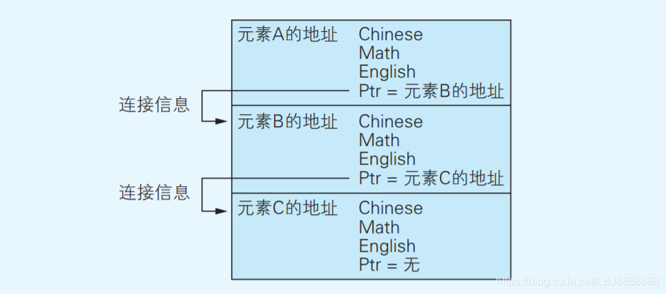 在结构体 TestResult(已变成了自我引用的结构体)的数组中,每 个元素都含有一个学生的语文、数学、英语成绩以及成员 Ptr。Ptr 中存 储着本元素接下来该与哪一个元素相连的信息,即下一个元素的地址。 在链表的初始状态中,会按照元素在内存上的分布情况设定成员 Ptr 的值