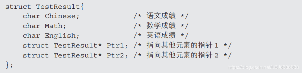 这里的成员 Ptr 存储了数组中另一个元素的地址。在 C 语言中,把存储着地址的变 量称为“指针”。这里的“*”(星号)就是指针的标志。诸位可以看到, Ptr 就是以结构体 TestResult 的指针(struct TestResult*)为数据类型的 成员。这种特殊的结构体可以称为“自我引用的结构体”。之所以叫这 个名字,是因为在结构体 TestResult 的成员中,含有以 TestResult 的指 针为数据类型的成员,这就相当于 TestResult 引用了与自身相同的数据 类型。