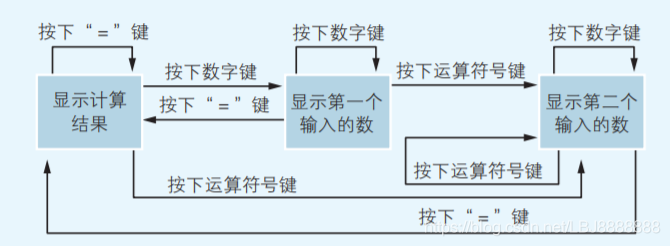 的计算器应用程序就可以看作包含三个 状态:“显示计算结果”“显示第一个输入的数”以及“显示第二个输入的 数”。随着用户按下不同种类的按键,状态也会发生转变。在状态转化图 中,在矩形中写上状态的名称,用箭头表示状态转化的方向,并且在箭 头上标注引起状态转化的原因(事件)