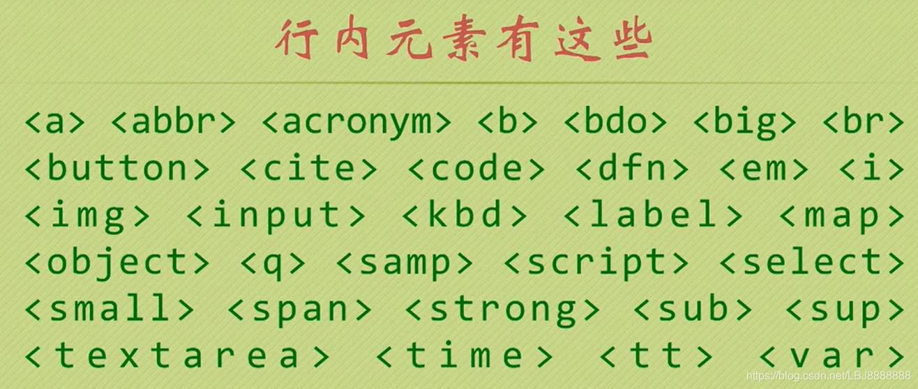 2. 行内元素:也叫做内联元素,一般都是语义级别的基本元素,内联元素一般只能容纳文本或者其他内联元素。