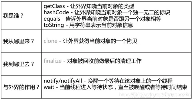他们分别回答了四个问题:我是谁,我从哪里来,我到哪里去,我与外界如何互相作用的。getClass和hashCode分别让外界知晓当前对象的类型和一个独一无二的标识。equals告诉外界当前对象是否和另一个对象相等。toString用字符串标识当前对象信息。clone方法可以让外界获得当前对象的一个拷贝。finalize方法可以实现对象被回收前最后的清理工作。notify()和notifyAll()方法用于唤醒一个等待在该对象上的一个线程或所有线程。wait方法是让当前线程进入等待状态,直至被唤醒或者等待时间结束。注意这里clone方法和finalize方法使用灰色表示,因为二者都属于protected方法,如果需使用则需要重写其实现。另外在重写clone还要注意深拷贝和浅拷贝的问题,finalize方法使用时具有不确定性,这里不推荐大家使用。