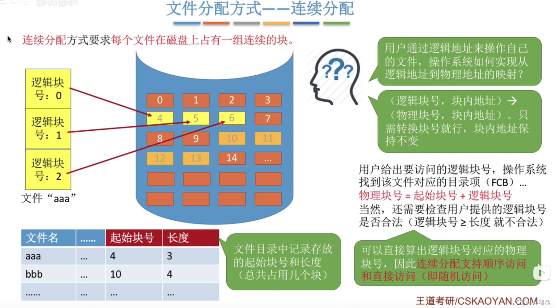 - 连续分配方式:每个文件在磁盘上占有一组连续的块