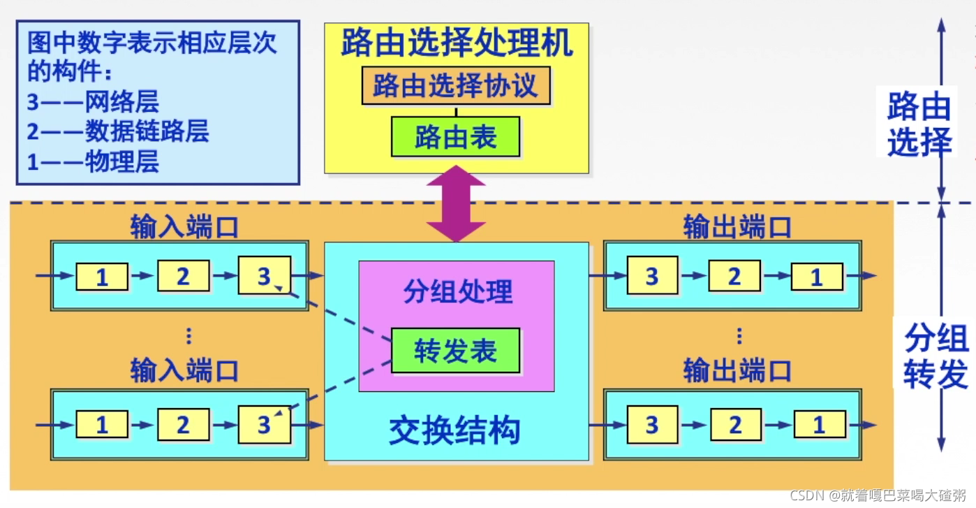 若收到RIP/OSPF分组等,则把分组送往路由选择处理机:若收到数据分组,则查找转发表并输出。