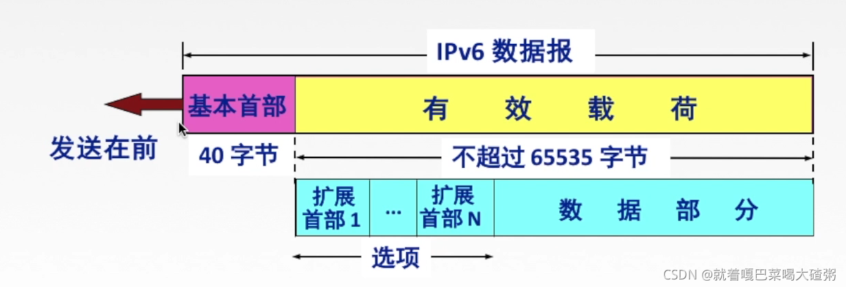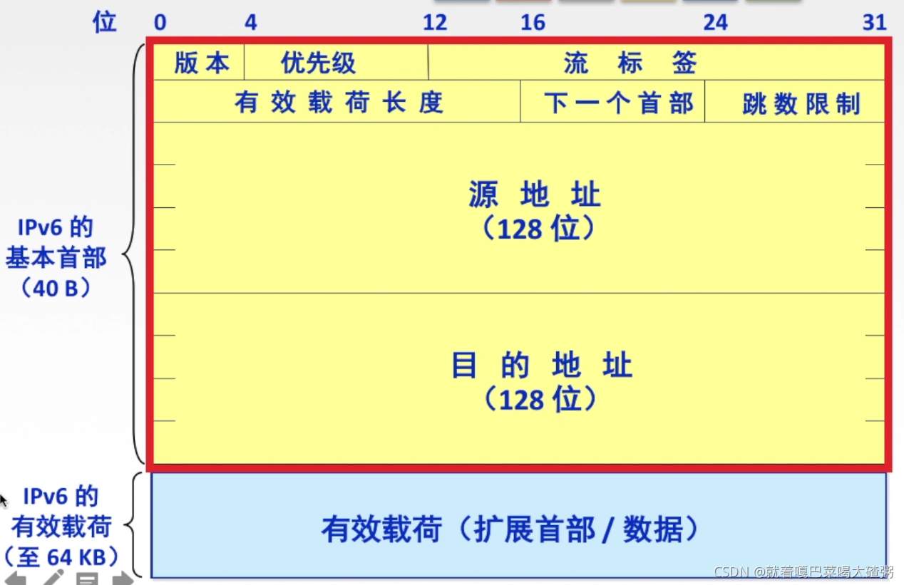 - IPv6首部长度必须是8B的整数倍,IPv4首部是4B的整数倍。