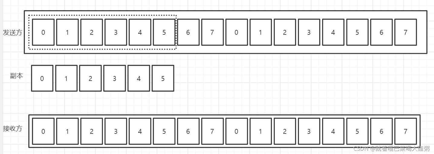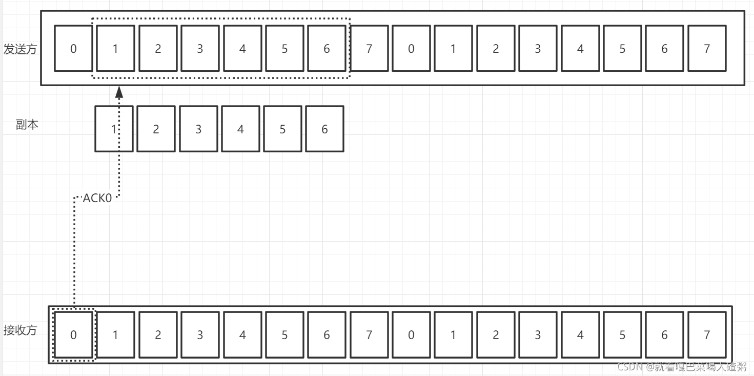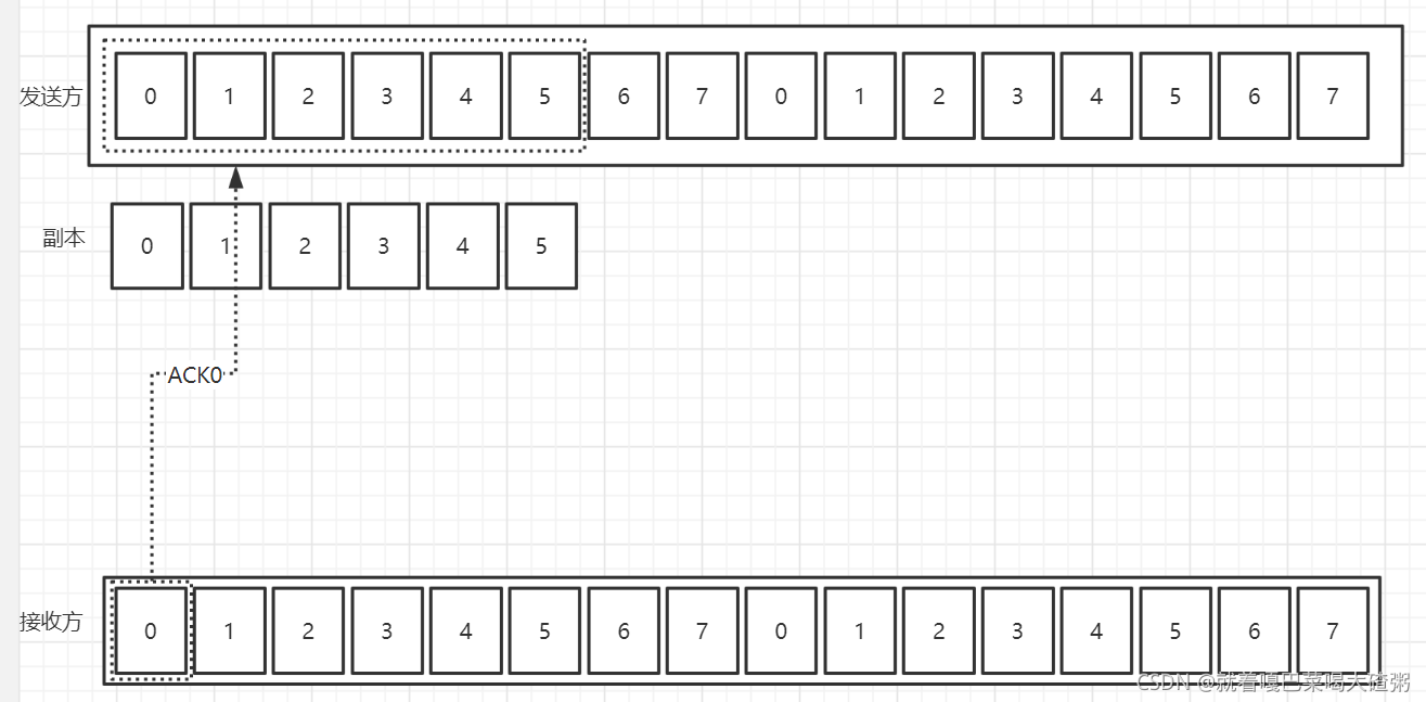 如图,假如发送方的发送窗口大小是6,首先发送0号帧,并建立0号帧的副本,防止帧丢失,然后发送0号帧,发送1号帧,一直到5号帧: