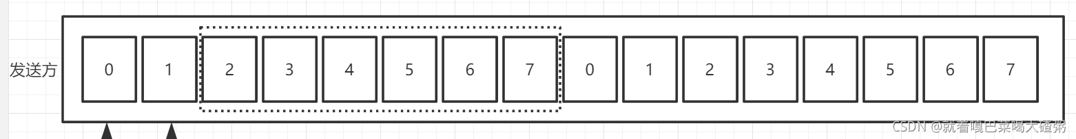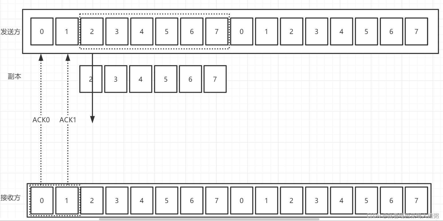 目前发送方就被分成了四个部分:发送完已经被确认的(0,1号帧),已经发送等待确认的(2号帧),还能发送的(34567号),还不能发送的(其余的)