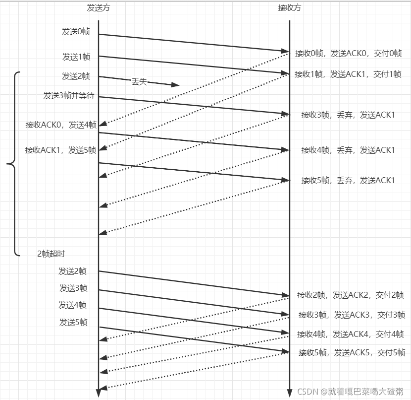 在GBN中,假设0号帧传输成功,但是1号帧未传输成功,接收方在接收0号帧之后,1号帧未收到,但是收到了23456号帧,但是接收方会忽略这些帧,这样发送方一直收不到1号帧的确认帧,直到触发了超时计时器,就会重新传1号帧及以后的帧。