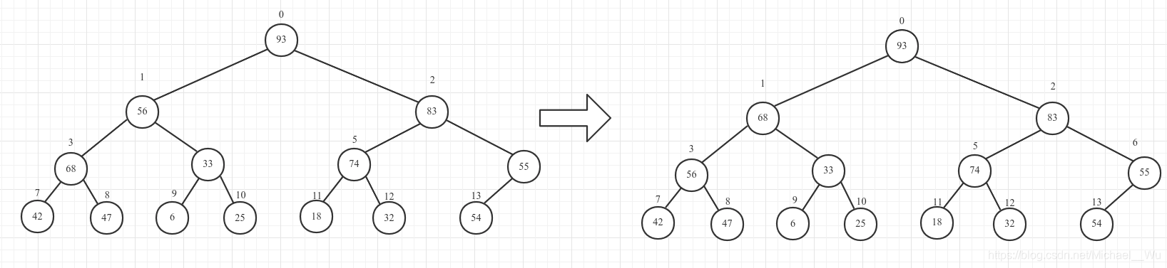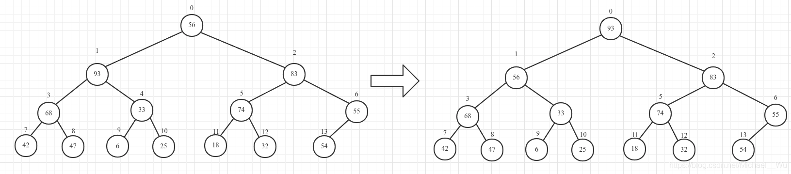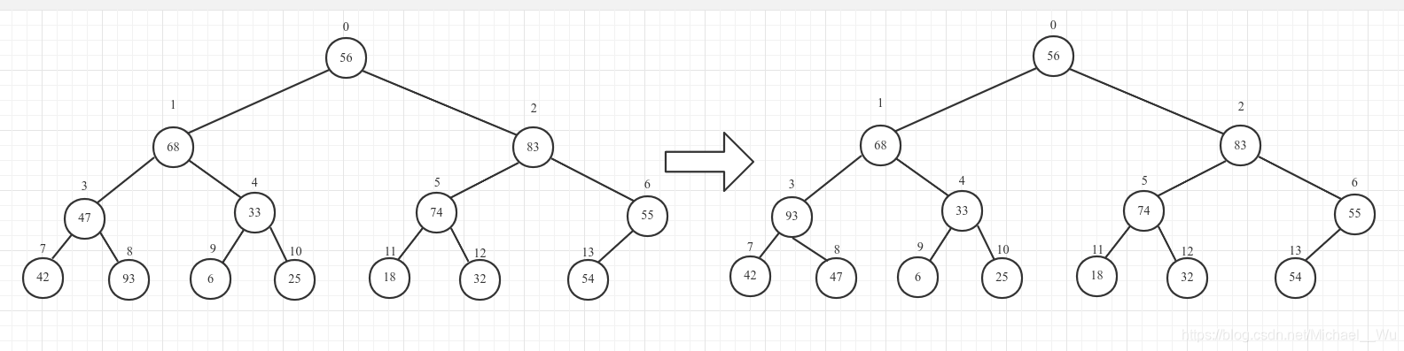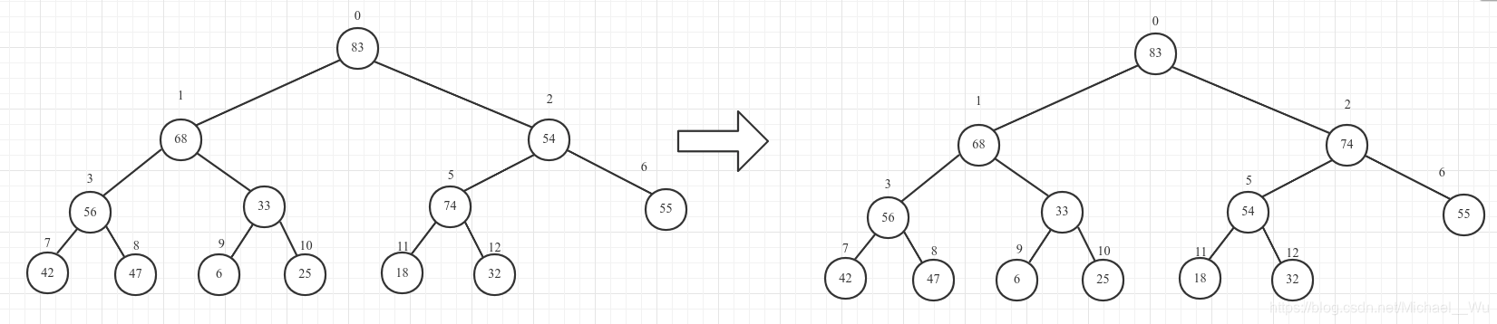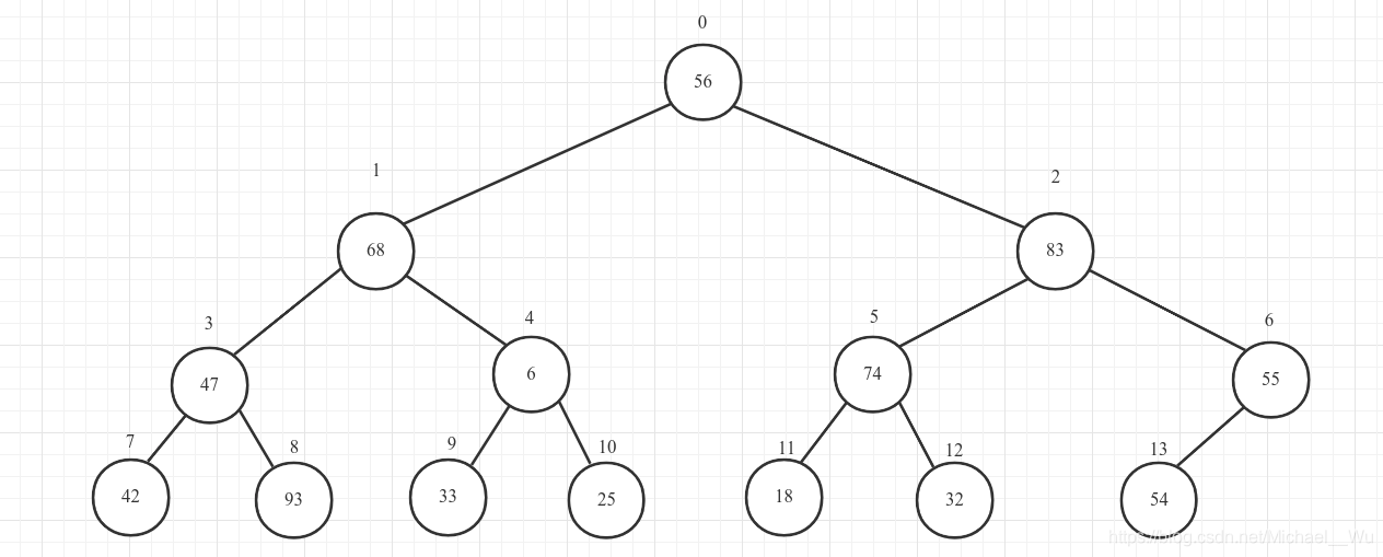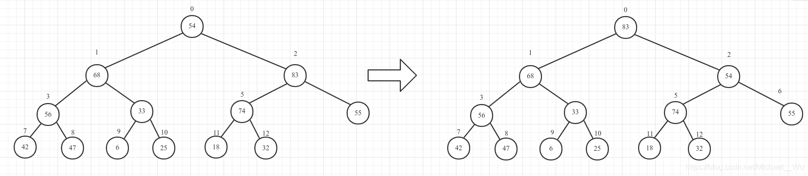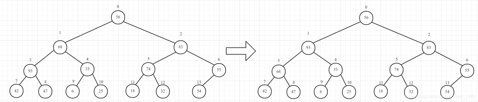 1. 首次构建时, 需要遍历所有的子树, 让所有的子树满足大顶堆性质, 而只有一个节点的子树则不需要遍历(因为不需要调整), 所以要从第一个非叶子节点的子树开始遍历, 构建大顶堆. 而第一个非叶子节点的子树根节点, 在数组中的下标为 n / 2 - 1(也就是6, 目前6不需要调整), 从此开始一直至0(注意当上层树发生变化时, 需要递归调整下层的树, 为什么要从下至上调整, 因为下层调整完成后, 已经把下层最大的调整至根节点了, 这样当根节点发生变化时, 只需要从上向下再调整一遍, 因为下层已经不可能有比上面更大的值了).