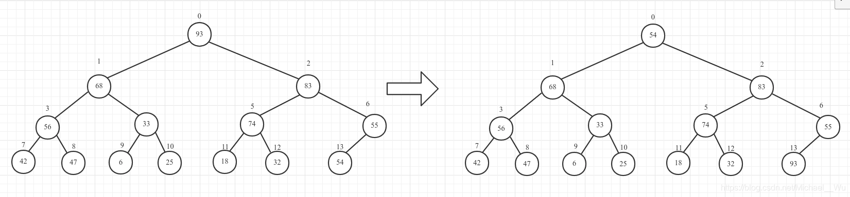 2. 首次构建完大顶堆后, 交换首个元素与最后一个元素的值, 然后重新构建大顶堆