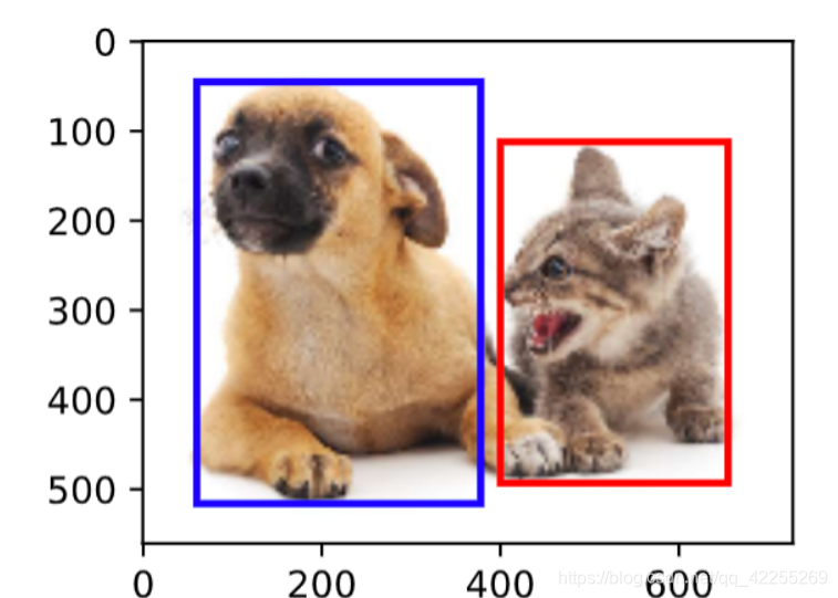 def bbox_to_rect(bbox, color): # 将边界框(左上x, 左上y, 右下x, 右下y)格式转换成matplotlib格式:# ((左上x, 左上y), 宽, 高)return plt.Rectangle(xy=(bbox[0], bbox[1]), width=bbox[2]-bbox[0], height=bbox[3]-bbox[1],fill=False, edgecolor=color, linewidth=2)