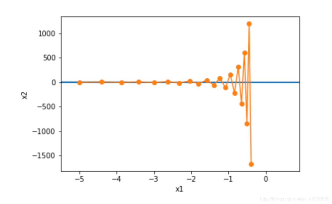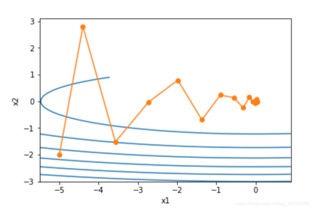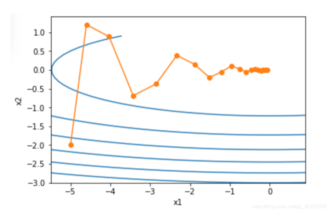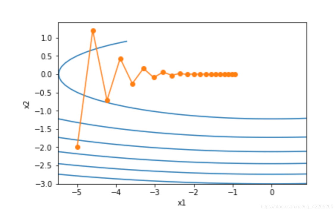 import torcheta = 0.4 # 学习率def f_2d(x1, x2):return 0.1 * x1 ** 2 + 2 * x2 ** 2def gd_2d(x1, x2, s1, s2):return (x1 - eta * 0.2 * x1, x2 - eta * 4 * x2, 0, 0)def show_trace_2d(f, results): plt.plot(*zip(*results), '-o', color='#ff7f0e')x1, x2 = np.meshgrid(np.arange(-5.5, 1.0, 0.1), np.arange(-3.0, 1.0, 0.1))plt.contour(x1, x2, f(x1, x2), colors='#1f77b4')plt.xlabel('x1')plt.ylabel('x2')def train_2d(trainer): x1, x2, s1, s2 = -5, -2, 0, 0 # s1和s2是自变量状态results = [(x1, x2)]for i in range(20):x1, x2, s1, s2 = trainer(x1, x2, s1, s2)results.append((x1, x2))print('epoch %d, x1 %f, x2 %f' % (i + 1, x1, x2))return resultsshow_trace_2d(f_2d, train_2d(gd_2d))