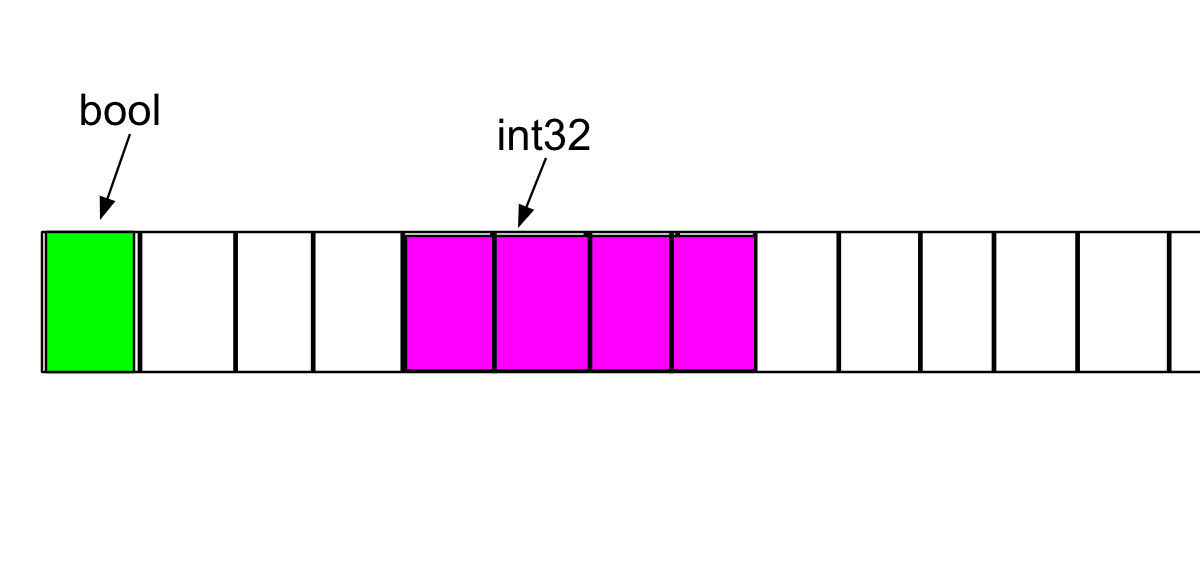 2.放入int32. 其对齐保证为4, 既偏移量为4的整数倍. 而现有地址中, 首个4的整数倍为第四个字节(中间三字节留空).