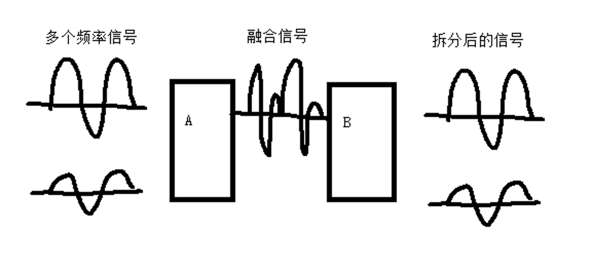 而频分复用, 就是通过将不同频率的信号进行融合, 然后在接收端再进行不同频率信号的分离. 当然, 叠加后的频率是不能超出传输媒介的频率带宽的.