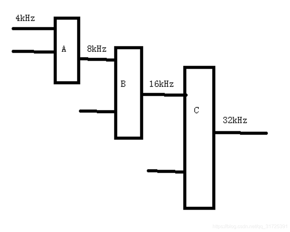 复用技术是可以连续复用的, 从A通过复用, 生成的信号可以在B处再次进行信号的叠加, 而遇到频率带宽低的信道可拆分传输, 最大限度的使用其传输性能.