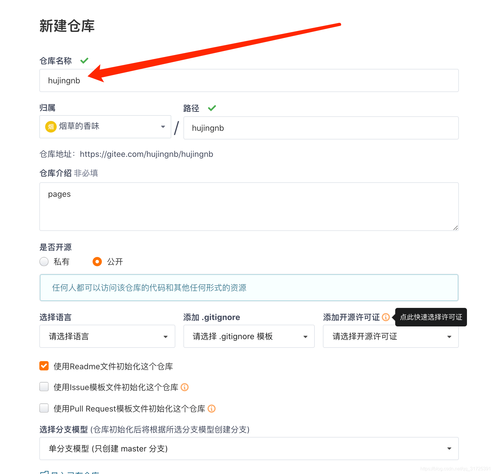 注意, 这里的仓库名和我的用户名是一样的. 因为如果和用户名不一致的话, 创建后的域名是: https://hujingnb.gitee.com/仓库名. 而使用相同的仓库名, 就可以省掉 url 的后缀.