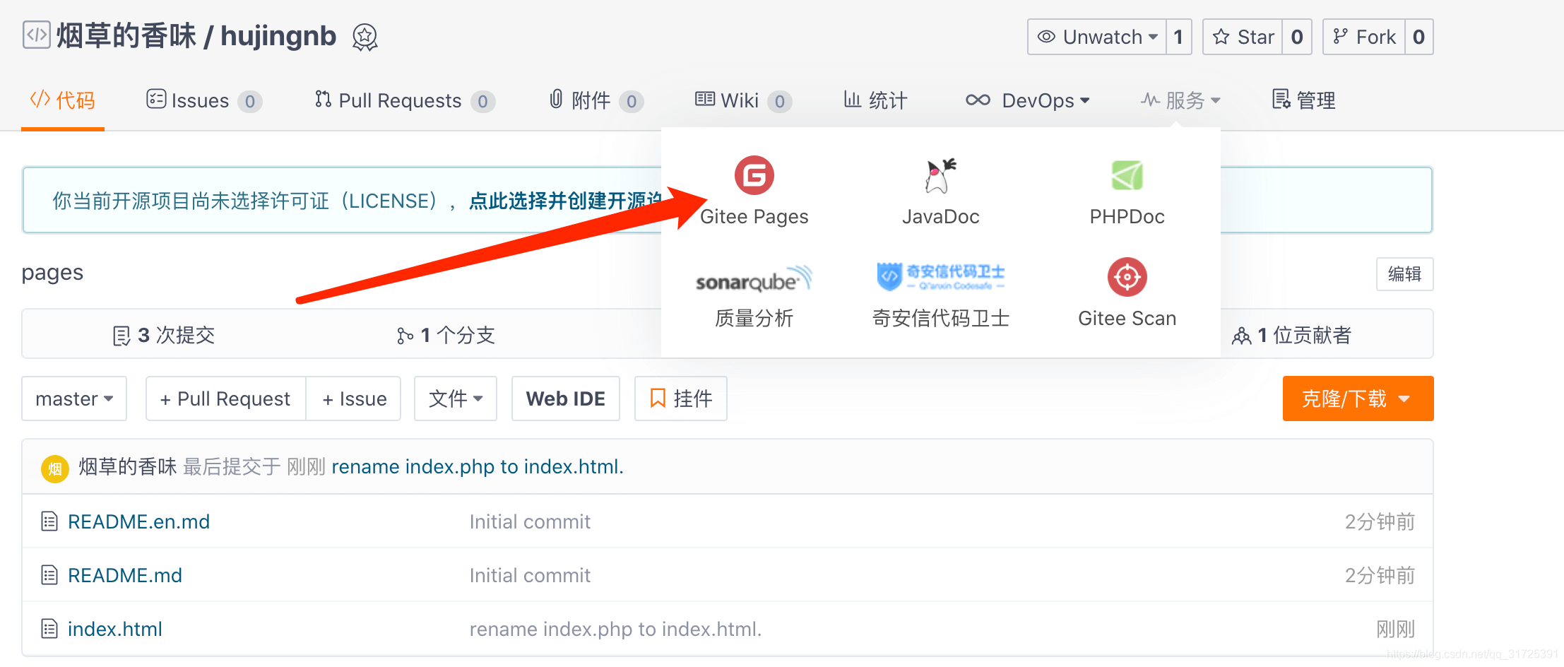 仓库创建完后, 为了测试, 我在项目的跟路径下创建了index.html.