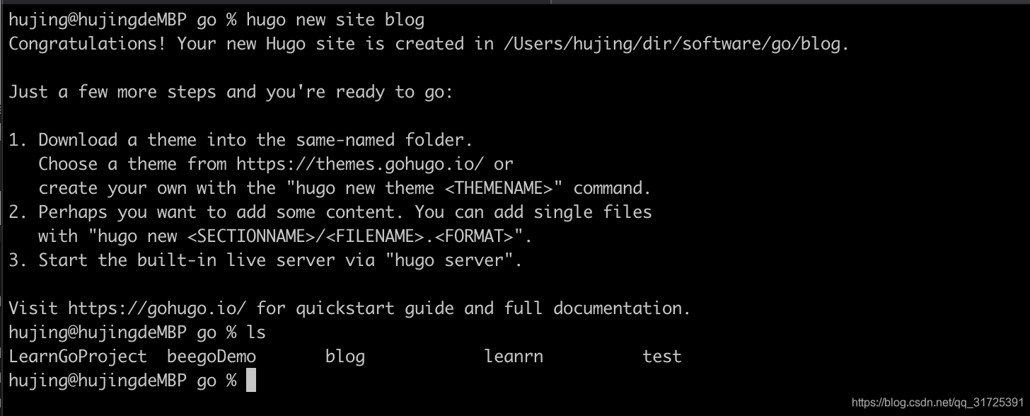 项目创建完成, 而且还很贴心的告诉了你接下来要做什么. 看着很简单么, 加主题, 加内容文件, 然后就可以启动了.