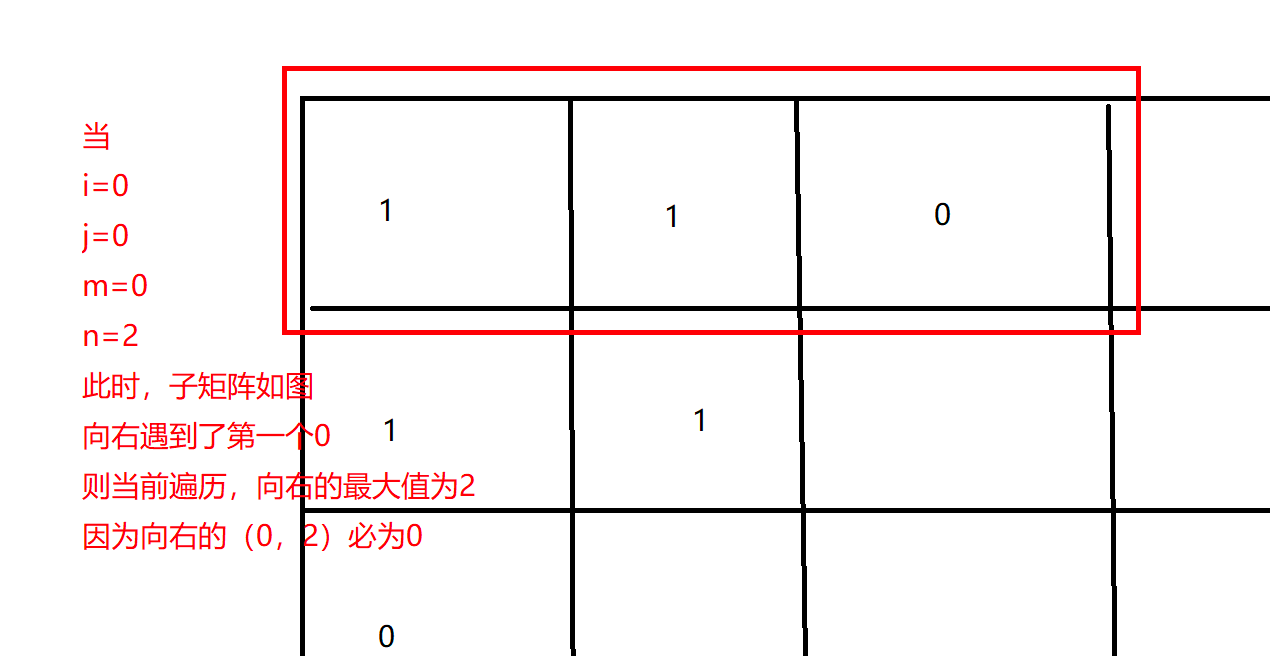 再如果向下找的时候, 碰到0, 那下一列的时候也没必要超过这里了, 因为子矩阵至少有一个0了, 如下图: