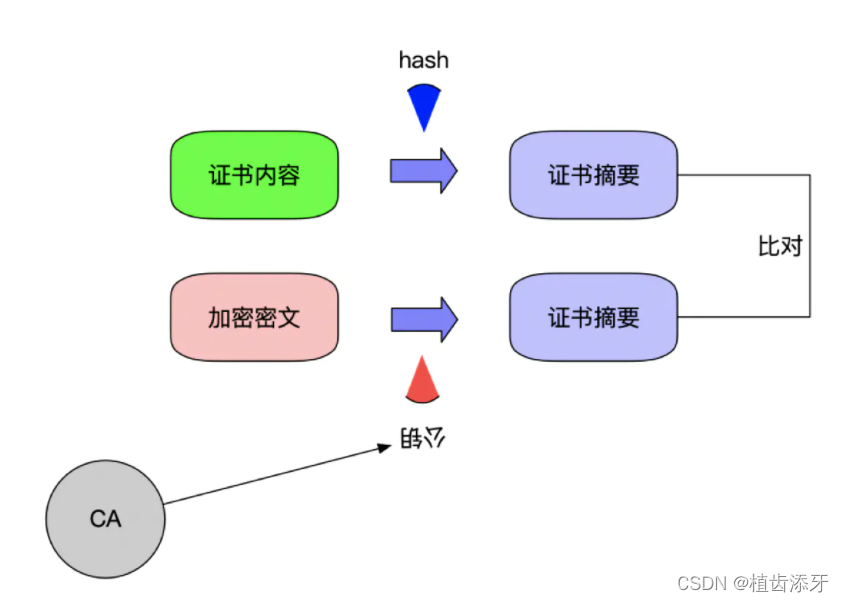 当客户端(接收方)发起请求,要客户端(发送端)的公钥的时候,服务器将该数字证书发送给客户端,客户端通过CA机构提供的公钥对加密密文进行解密获得散列值(数字签名),同时将证书内容使用相同的散列算法进行Hash得到另一个散列值,比对两个散列值,如果两者相等则说明证书没问题。