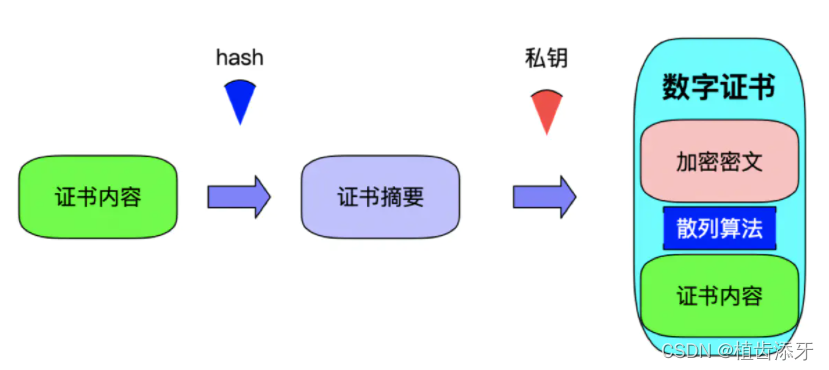 一个证书中含有三个部分:"证书内容,散列算法,加密密文"。证书内容会被散列算法hash计算出hash值,然后使用CA机构提供的私钥进行RSA加密。过程如下图: