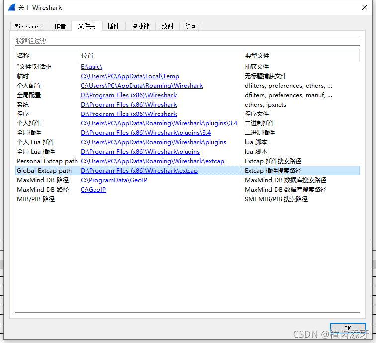 选择 Global Extcap path,点击后面的位置,把 Sniffer_Software/extcap/ folder 中的内容复制到这个文件夹下面.