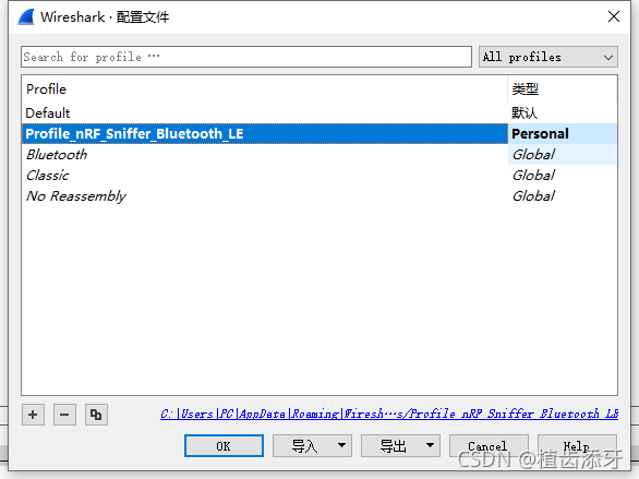 帮助→关于Wireshark→个人配置. 打开Profiles, 把Profile_nRF_Sniffer_Bluetooth_LE整个文件夹复制到这个目录下.