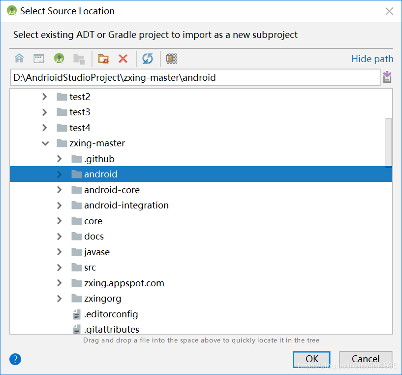 2. 在新建项目中,file→new→import Module,将下载好的zxing项目作为module导入进来,注意,选择android这个文件夹。然后next→finish。这里面可以按照自己的需要给module取名,默认的“android”也是可以的。