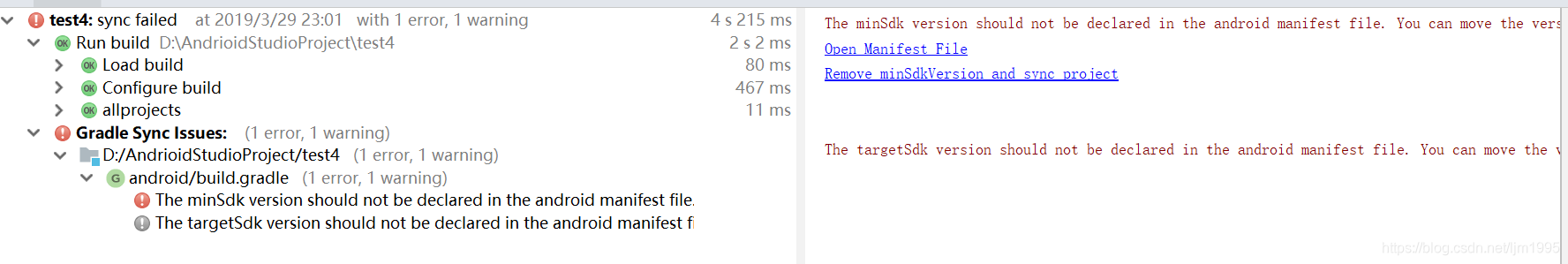 同时也出现了我们遇到的第一个bug,提示“The minSdk version should not be declared in the android manifest file. You can move the version from the manifest to the defaultConfig in the build.gradle file.” 根据提示,打开android(新导入的module名)→src→main→AndroidMainfest.xml,里面定义了一句