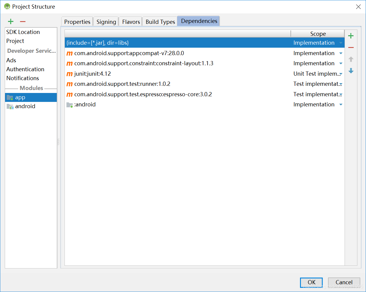 5. 继续引库。右键项目,Open Module Settings→打开窗口中左边选择application module(app),右边选dependencies→点绿色加号→Module dependency→:android→OK,OK.