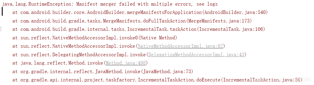 6.Sync后,又一个意外之喜来了,提示错误“java.lang.RuntimeException: Manifest merger failed with multiple errors, see logs”。接下来我们要看看是什么情况。点击左下角Terminal,输入
