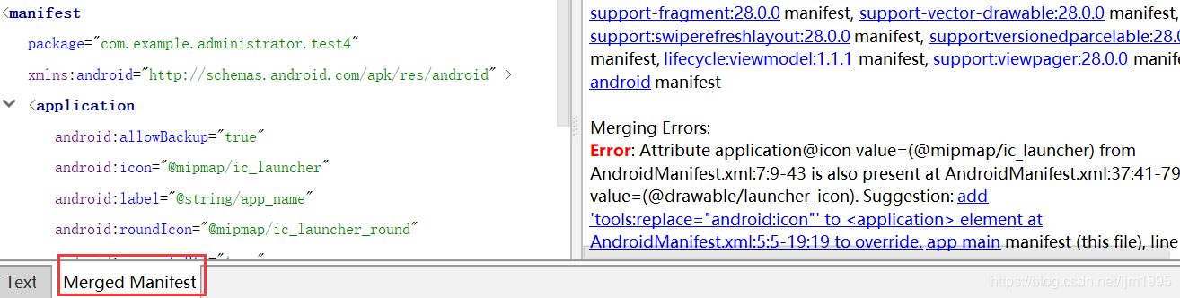 提示说Manifest文件出问题了,那就去看看Androidmanifest.xml,打开这个文件后,点击下图左下角Merged Manifest,就可以在下图右边的框框里面看到error信息了。
